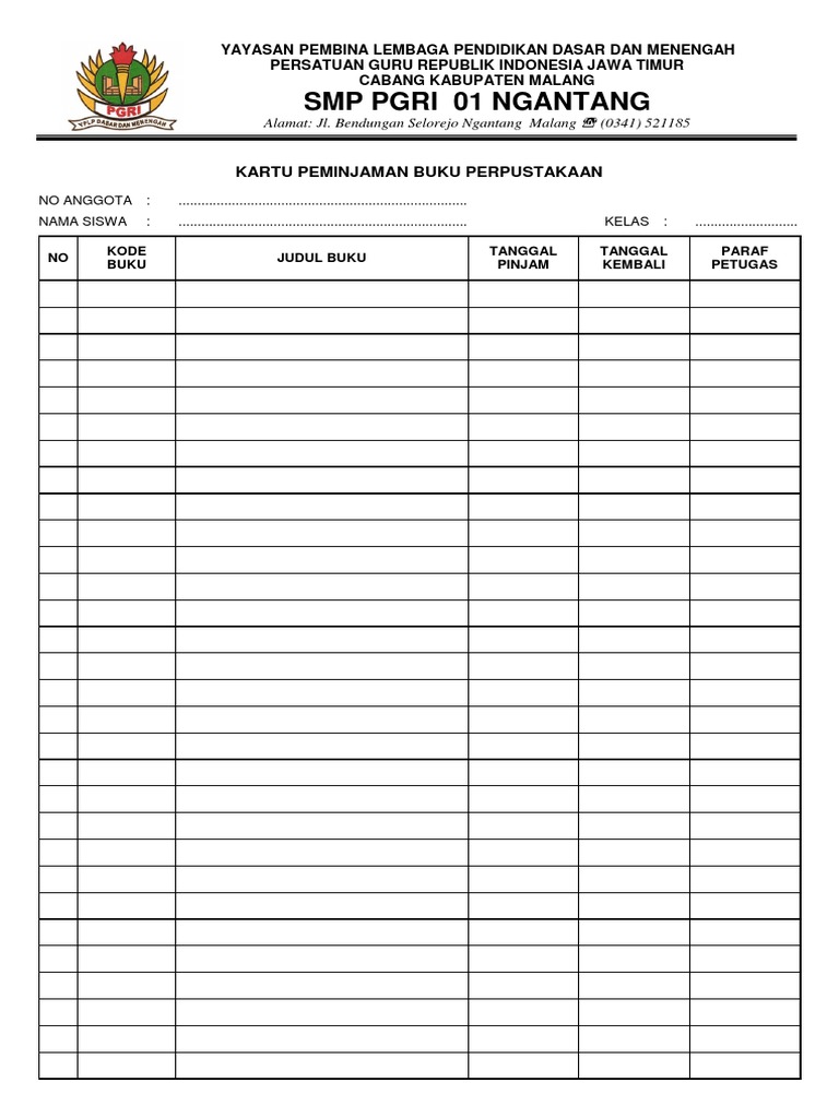 Sebagai upaya mewujudkan tertib administrasi di perpustakaan, pengelola tentunya perlu melengkapi setiap kebutuhan administrasi mulai dari menyiapkan buku induk perpustakaan hingga kartu peminjaman dan pengembalian buku. May 21, 2018 · untuk kartu buku ukuran standar kertasnya sekitar 12,5 cm x 7,5 cm (tidak mutlak) yang berarti sedikit lebih kecil dari kantong bukunya. Jadi kartu yang di hasilkan akan sangat praksis dan efesien untuk mempermudah dan memperlancar proses administrasi perpustakaan sekolah. Apabila ingin download formatnya dengan ekstensi.docx, silakan klik link dibawah ini. Apakah kartu peminjaman mencantumkan identitas anggota perpustakaan?